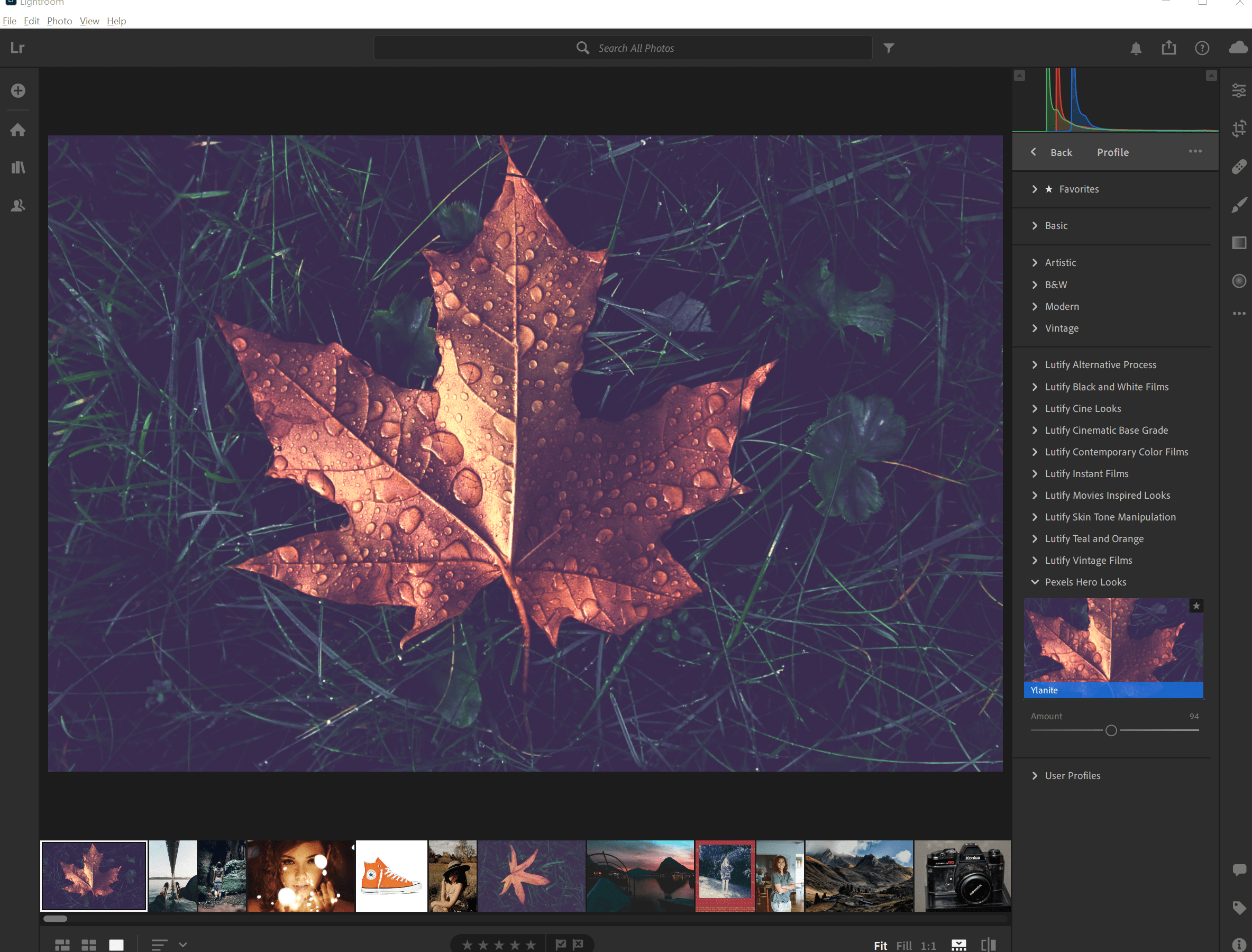 Now I can just click on Profiles, navigate to Ylanite and apply it! The amount can be adjusted with a single slider and serves as a starting point for further editing!
